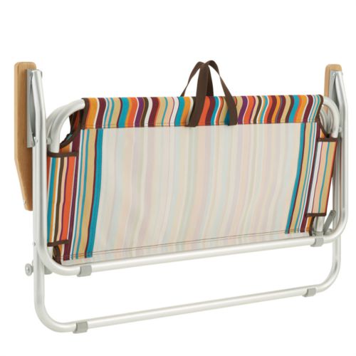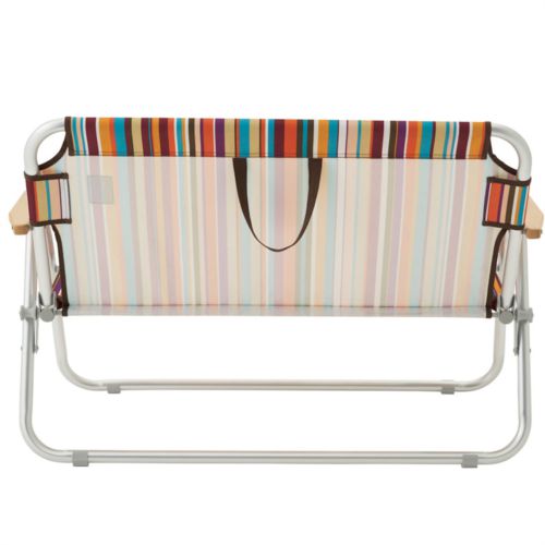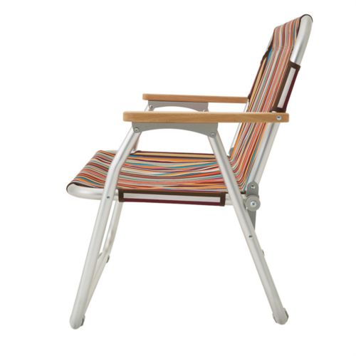 サイズ:102.5×55×67cm(座高32.5cm) 収納サイズ:102.5×12×64cm 耐荷重目安:160kg 主素材:フレーム/アルミ、生地/ポリエステル、肘掛/木材